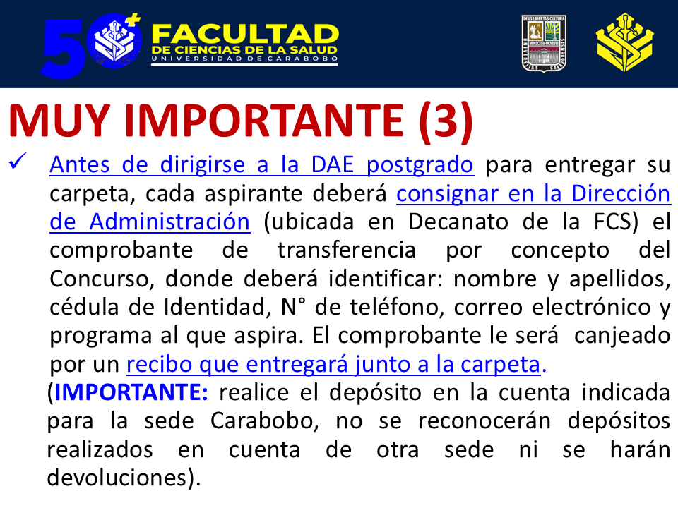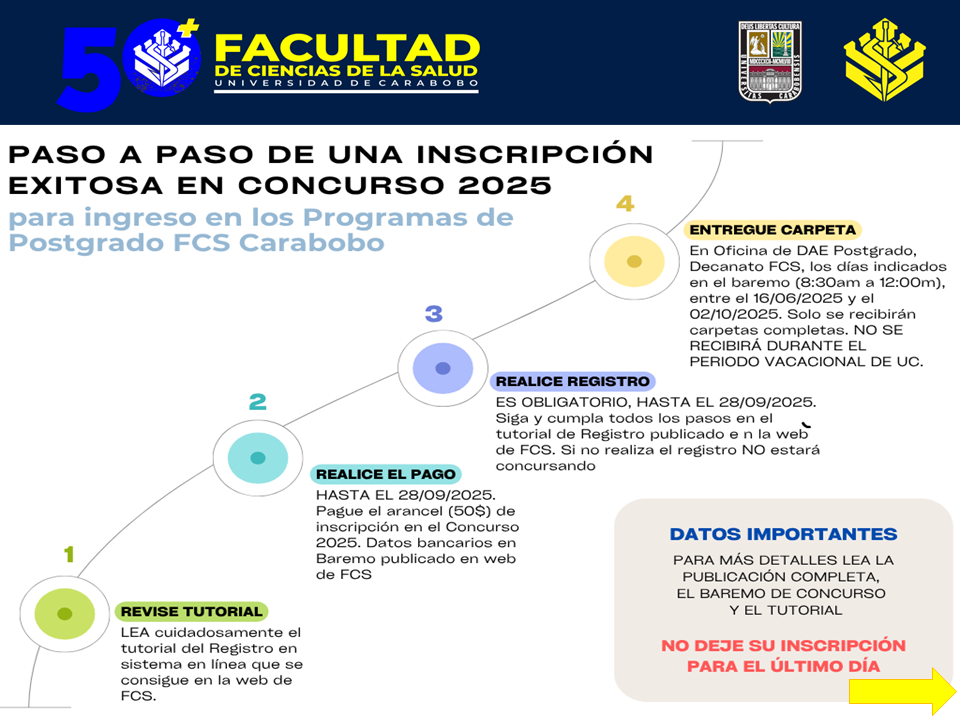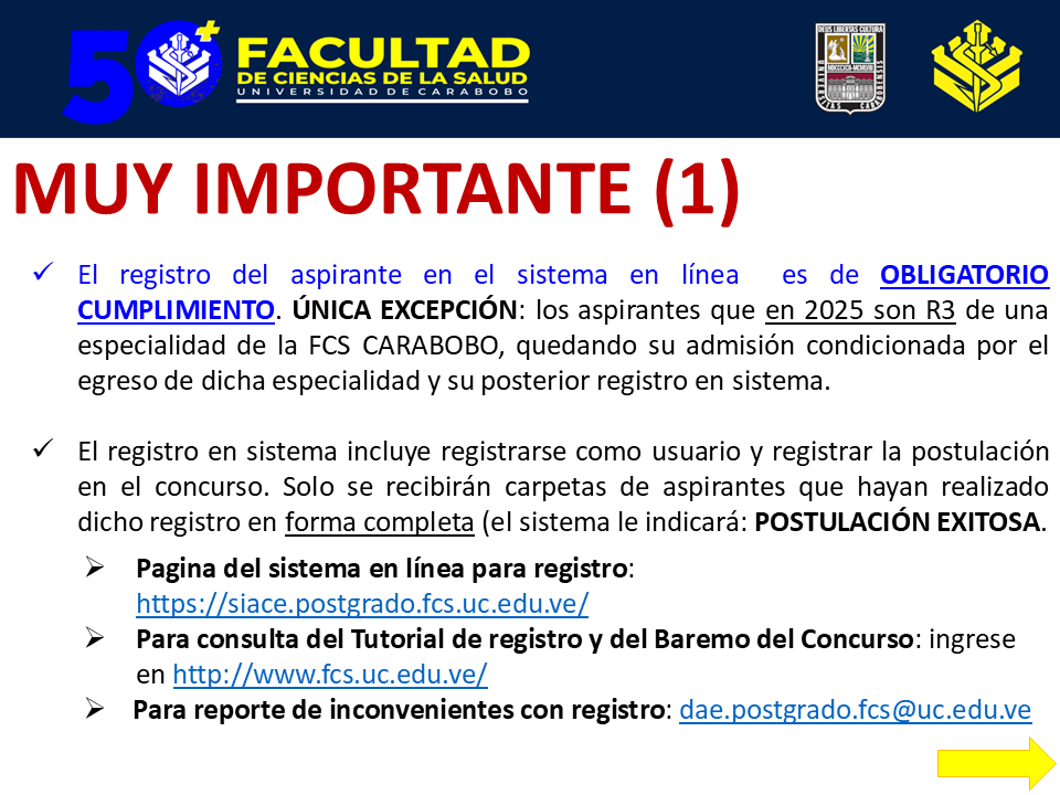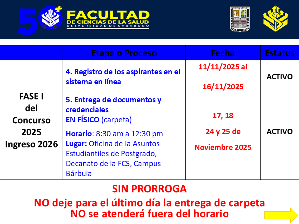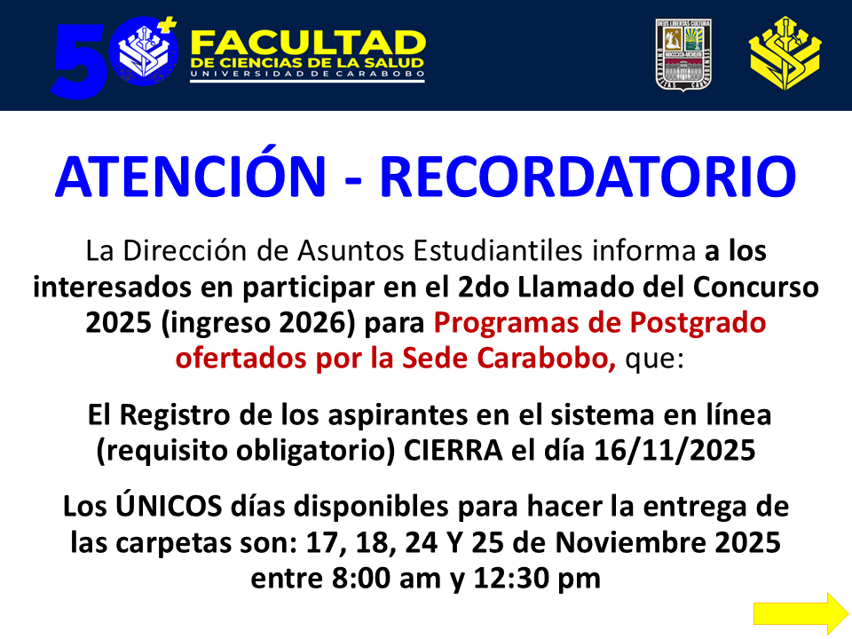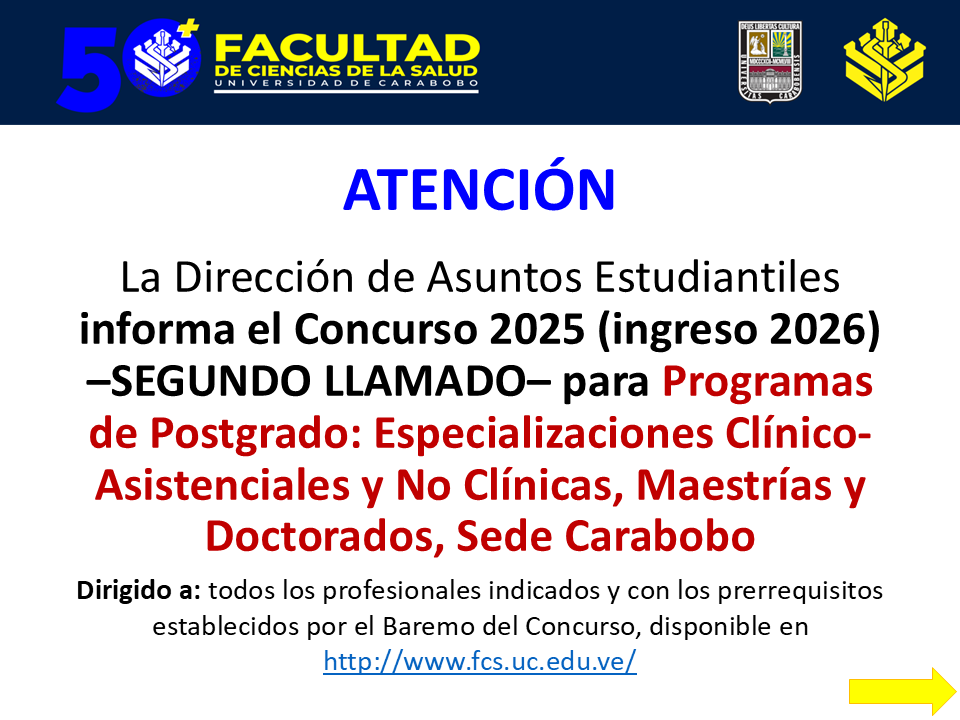 Destacados Dirección de Postgrado Sede Carabobo: Procedimiento de selección, admisión e inscripción (Concurso 2025 – Ingreso 2026) | Segundo llamado Ver tutorial de registro en el sistema en línea de Sede Carabobo Ingreso al sistema en línea de Sede Carabobo Baremo Especializaciones Clínicas Baremo Maestrías Baremo Doctorados