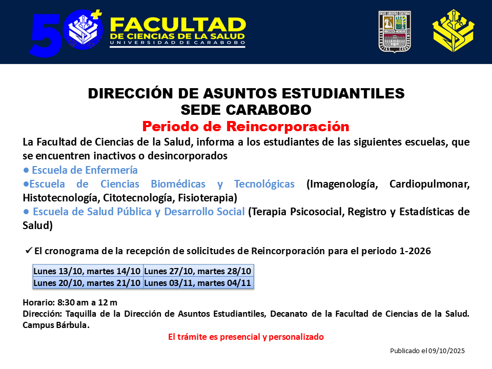 Destacados DAE Sede Carabobo: Solicitud de reincorporación para las carreras técnicas, Enfermería y Fisioterapia (1-2026) Ver instructivo de solicitud aquí