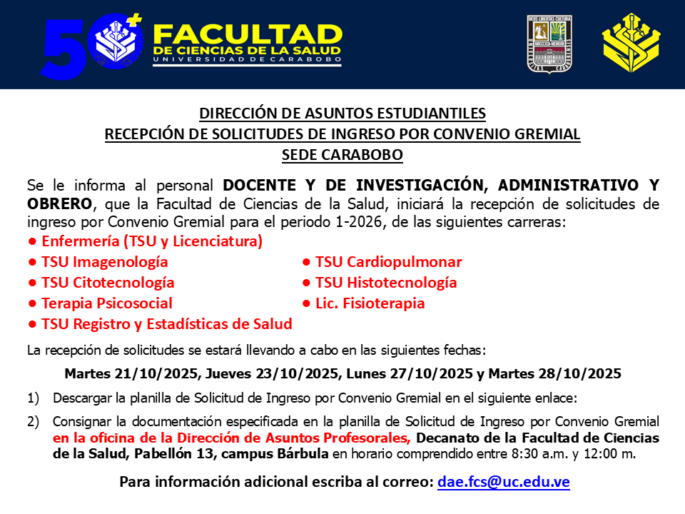 Destacados DAE Sede Carabobo: Solicitud de ingreso por Convenio Gremial a las carreras técnicas, Enfermería y Fisioterapia Descargar planilla de solicitud de ingreso por Convenio Gremial aquí