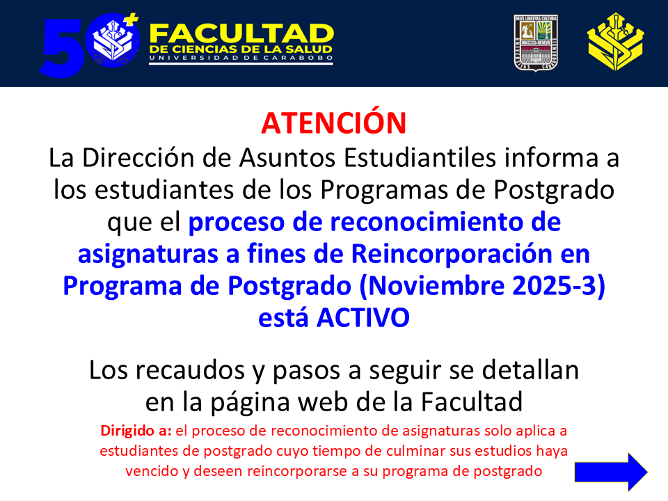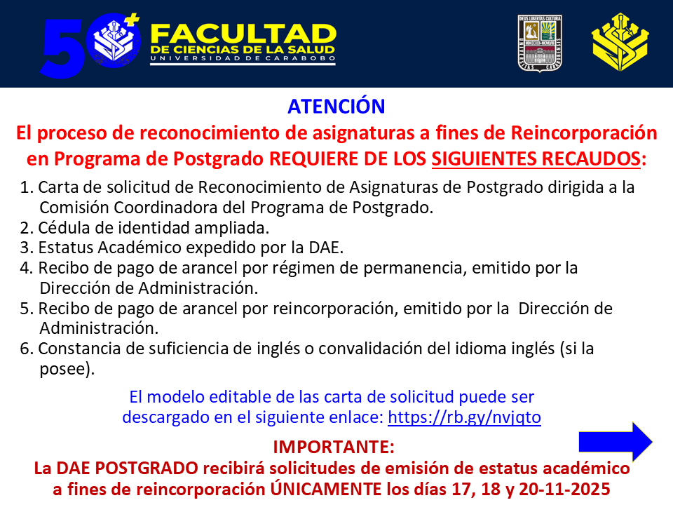 Destacados DAE Postgrado Sede Carabobo: Proceso de reconocimiento de asignaturas a fines de Reincorporación en Programa de Postgrado Descargar modelo editable de la carta aquí Completar registro en formulario Google aquí
