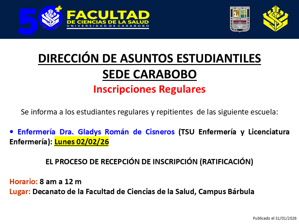 Inscripción DAE Sede Carabobo: Inscripción de estudiantes regulares y repitientes de la Escuela de Enfermería Ver instructivo de inscripción aquí